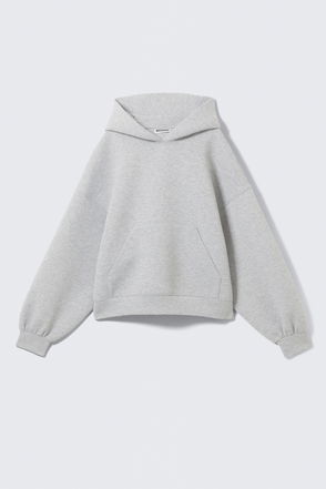 A cozy oversized hoodie made from a soft 80/20 organic cotton and recycled polyester blend. It falls below the hips, has a large double layered hood with a drawstring, ribbed cuffs and hem, and a roomy kangaroo pocket.