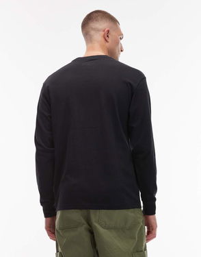 The Amped Striped Long Sleeve is a soft organic cotton top with a characteristic texture. It is styled with a round neck, cuffed sleeves, and short slits on the sides. The model wears size medium that measures 116 cm in chest circumference, 77 cm in length and 64 cm in sleeve length.