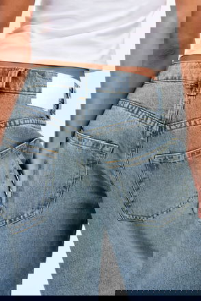 A pair of long, low waisted loose fit straight leg denim shorts crafted from an organic cotton streaky denim enhanced with recycled cotton. They have a classic 5-pocket look, a zip fly, and fall mid calf.