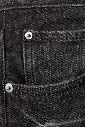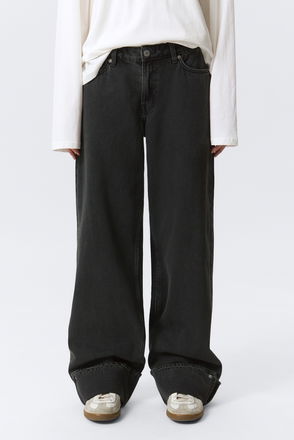 A pair of low waist loose fit straight leg jeans made from rigid cotton denim. They have five pocket detail, a zip fly, and a fabric label.