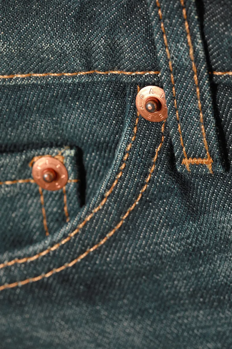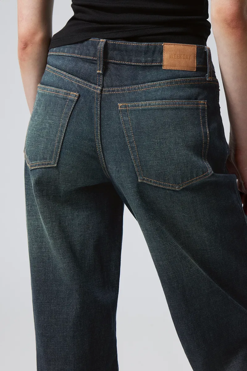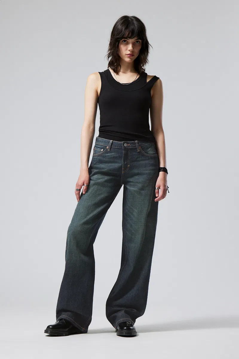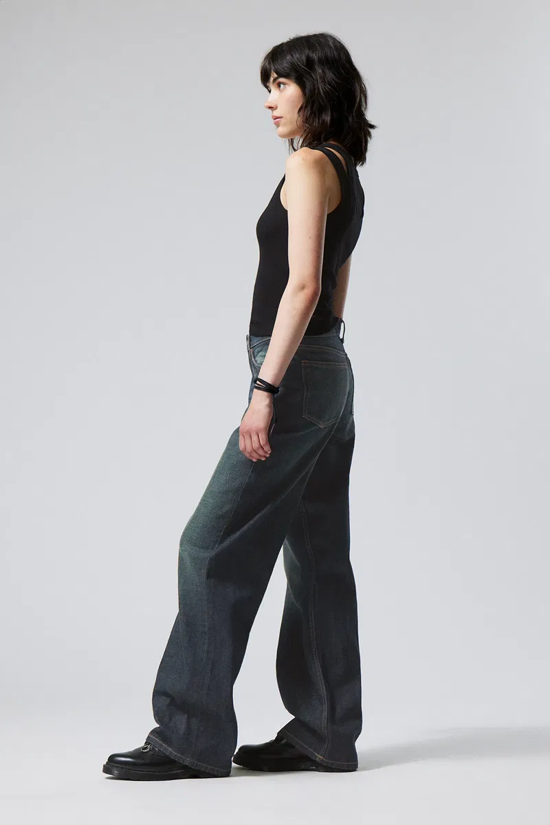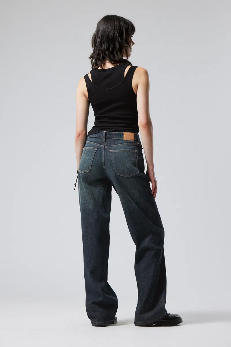 A pair of low waist loose fit straight leg jeans made from rigid cotton denim. They have five pocket detail, a zip fly, and a fabric label.