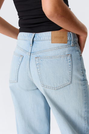 A pair of low rise jeans with a loose fit, wide leg and long length. These jeans are crafted from organic cotton rigid denim enhanced with recycled cotton.