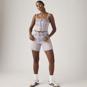 A pair of baggy, knee-length, loose-fit denim shorts made from an organic cotton rigid denim enhanced with recycled cotton. These jorts have a classic five pocket look and folded hems.
