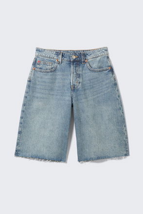 A pair of baggy, knee-length, loose-fit denim shorts made from an organic cotton rigid denim enhanced with recycled cotton. These jorts have a classic five pocket look and folded hems.