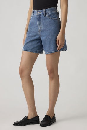 A pair of baggy, knee-length, loose-fit denim shorts made from an organic cotton rigid denim enhanced with recycled cotton. These jorts have a classic five pocket look and folded hems.