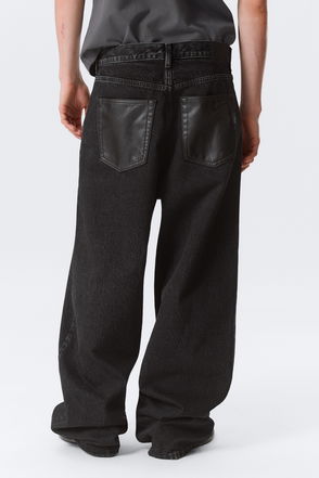 A pair of loose and baggy wide leg jeans made from a rigid cotton denim. These favourites have classic five pocket details, a zipper fly, large back pockets, and stitched rivets.