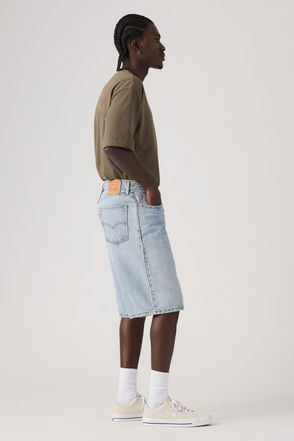 A pair of baggy ankle-length denim shorts with a loose fit crafted from an organic cotton rigid denim, enhanced with recycled cotton. They feature a classic 5-pocket design, a button fly, and roomy legs.
