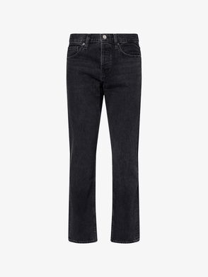 Barrel jeans are a loose fit pair with a medium waist and tapered, cocoon-like legs. This pair comes in a softly washed black.