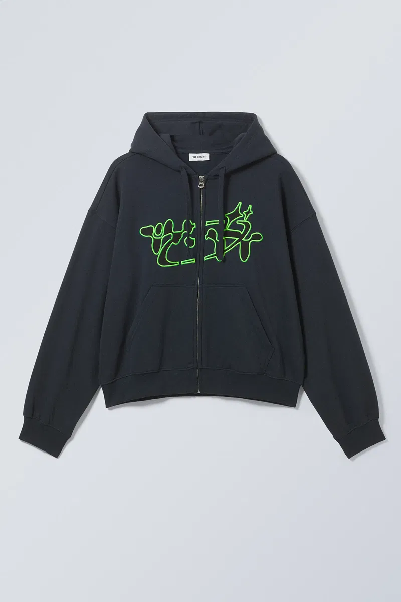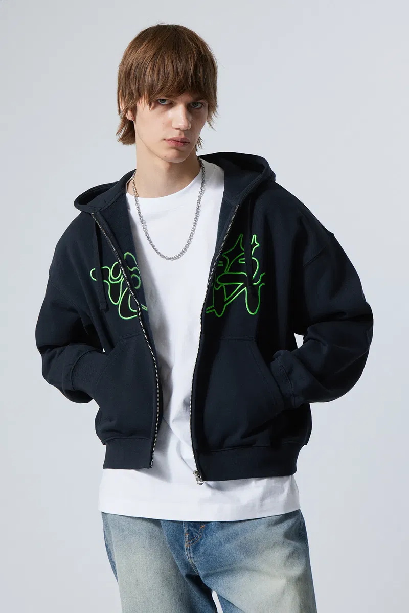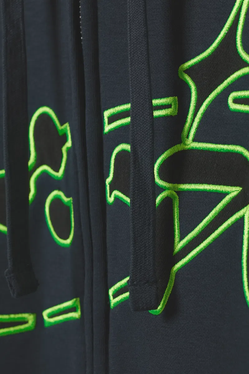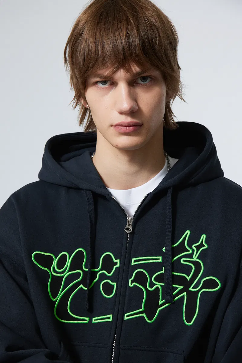 It has a textual graphic embroidery: "tech way", double layered drawstring hood, slightly dropped shoulders, a sturdy front zipper, ribbed finishes and a soft fleecy inside.