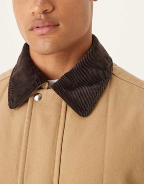 A single-breasted workwear-style jacket made from sturdy cotton twill. It has a boxy fit, two big front flat patch pockets, and a straight hem.