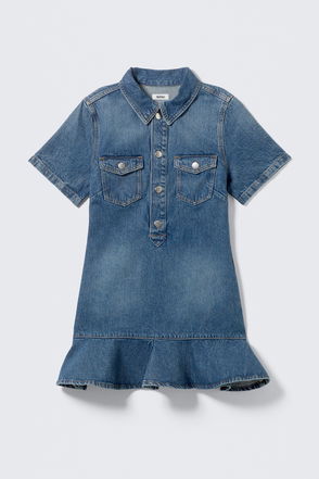 The Carol Rinsed Denim Dress is a denim mini in a fitted silhouette. styled with a frontal zipper, flap pockets with metal buttons and seams in contrasting thread colour.