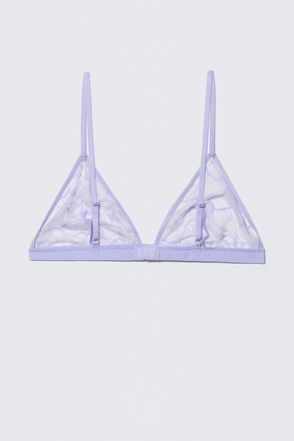 Cat Triangle Bra is a soft bra with an all-over ribbed quality. It has triangle-shaped cups, a hook-and-loop closure at back, and tonal adjustable shoulder straps.