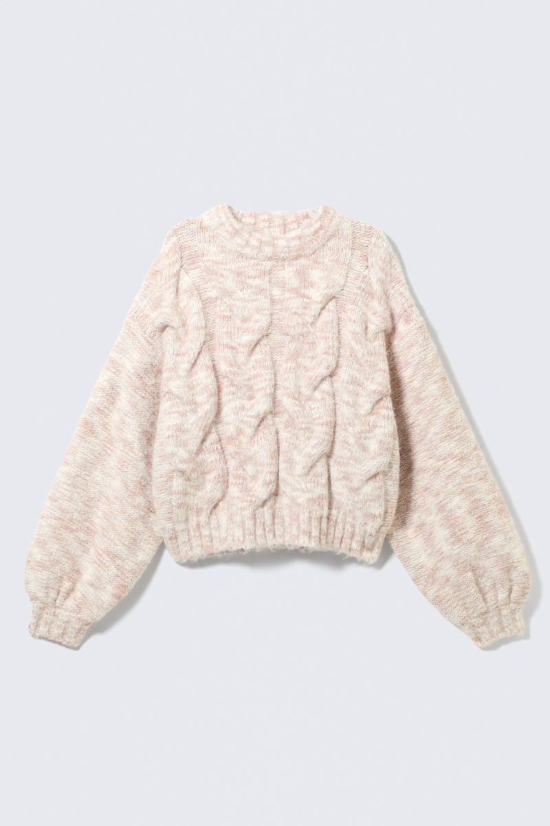 A chunky cable-knit sweater designed with dropped shoulders and ribbed trims at the neckline, cuffs, and hem.
