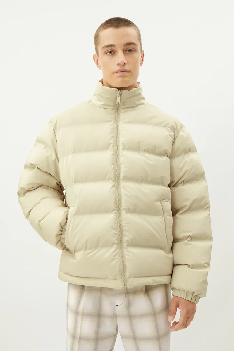 A classic puffer jacket made entirely from recycled polyester. It has a monochrome front zipper, mock neck, side slit buttoned pockets, a straight bottom hem and elasticated cuffs.