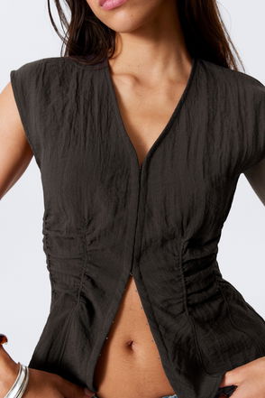 A sheer blouse with a regular fit made from a soft and light wrinkled chiffon. This stand-out piece has a round neckline that fastens with three ties, two back darts, has slit cuffs, neat babylock edges, and falls just below the hips.