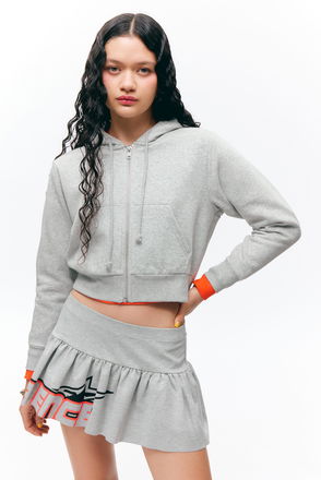 A cropped printed sweatshirt made from soft fleece jersey cotton and recycled polyester. It falls at the hips, is slightly longer in the back, has a print on the décolletage, ribbed hems and neckline.
