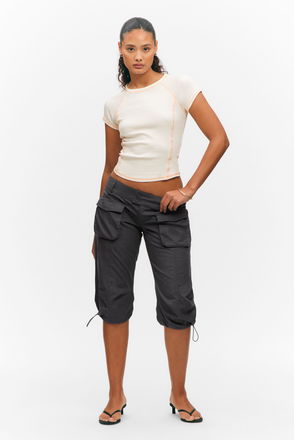 A short T-shirt with a slim fit crafted from a soft and stretchy modal fabric. It has a round neckline and curved edges.