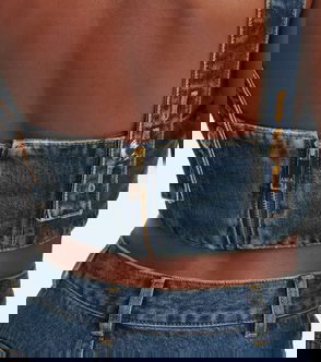 A standout denim bustier top with a slim fit, crafted from an organic cotton rigid denim enhanced with recycled cotton. It features thin adjustable shoulder straps, a folded front top hem, decorative buttonhole stitching along the side and back top hem, and a metal back zip closure.