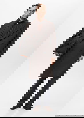 A long double-breasted wool-blend coat cut to a loose fit. It features notch lapels, structured shoulders, button closure, slanted welt pockets, an inner pocket, and a back slit.