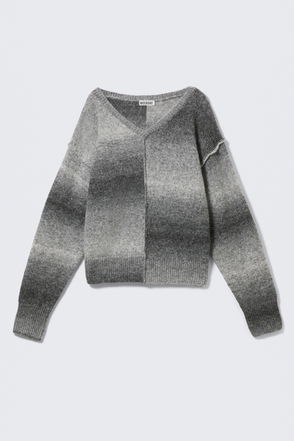 The Eda Sweater offers a spacious fit with a plunging V-neck and a warm touch of a densely knitted material. It has dropped shoulders and batwing sleeves.