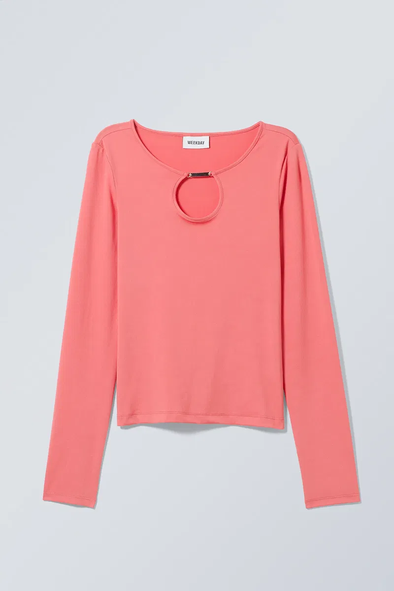 A fitted long sleeve top made from a soft and stretchy jersey. It has cut-out detailing with a metal attachment at the front, double-folded hems, and falls just below the hips.