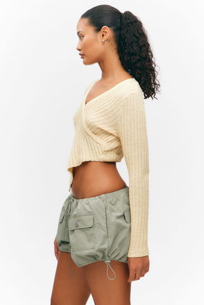 An oversized cropped v neck sweater made from a soft blend of recycled materials including elastane for extra comfort and flexibility, and a touch of rsw wool for softness and warmth. It has a boxy cut with a deep v-neck and ribbed edges.