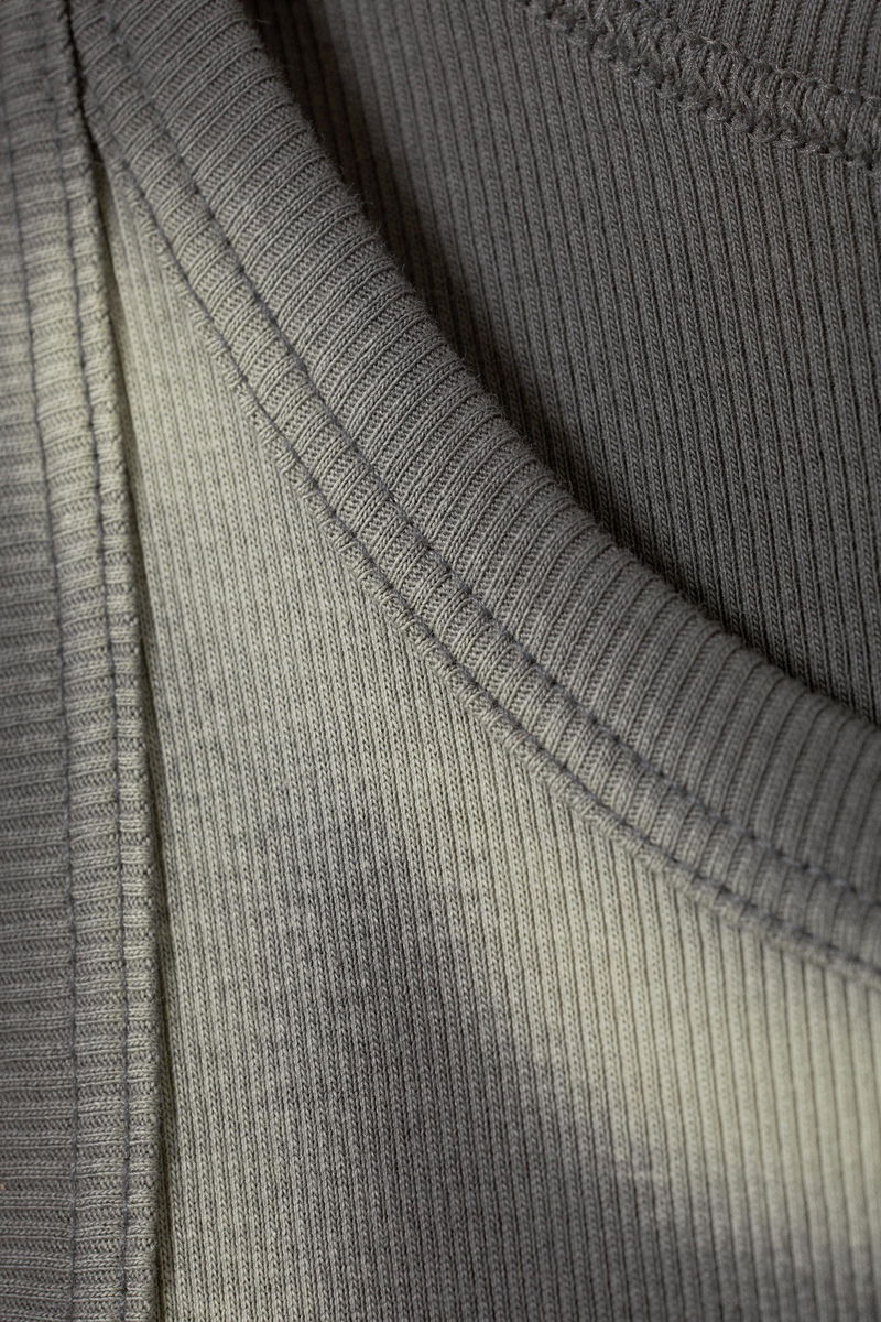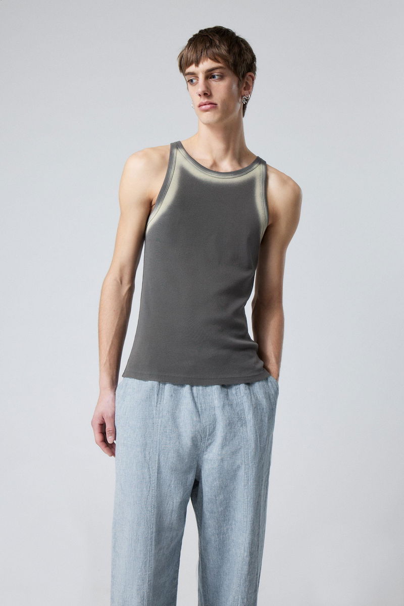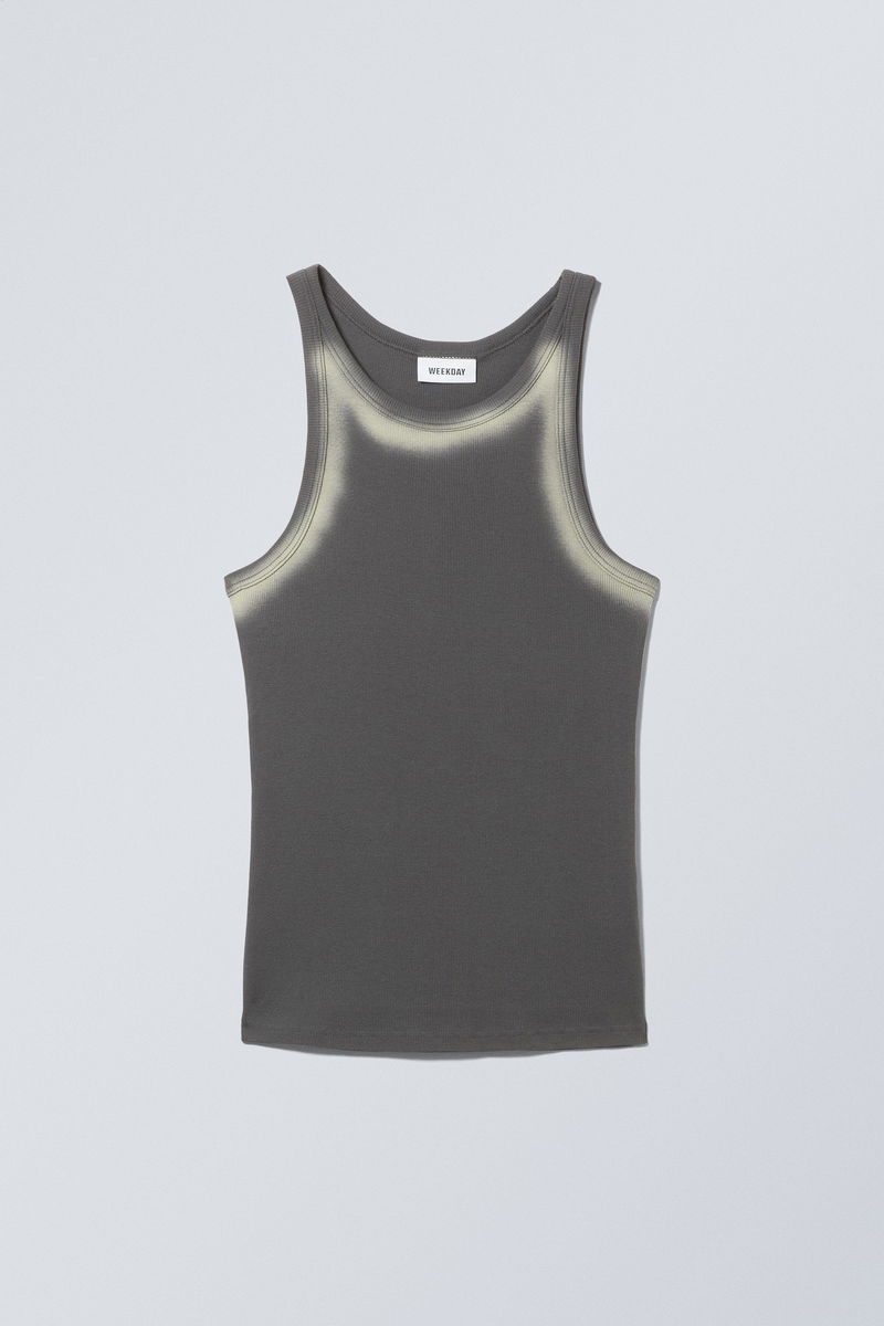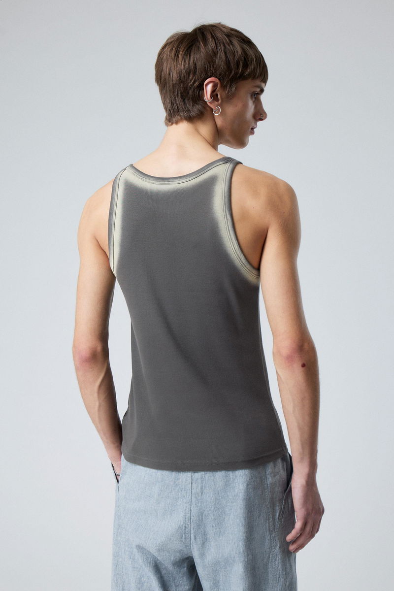 This tank has a faded look, and a ribbed neckline and edges.