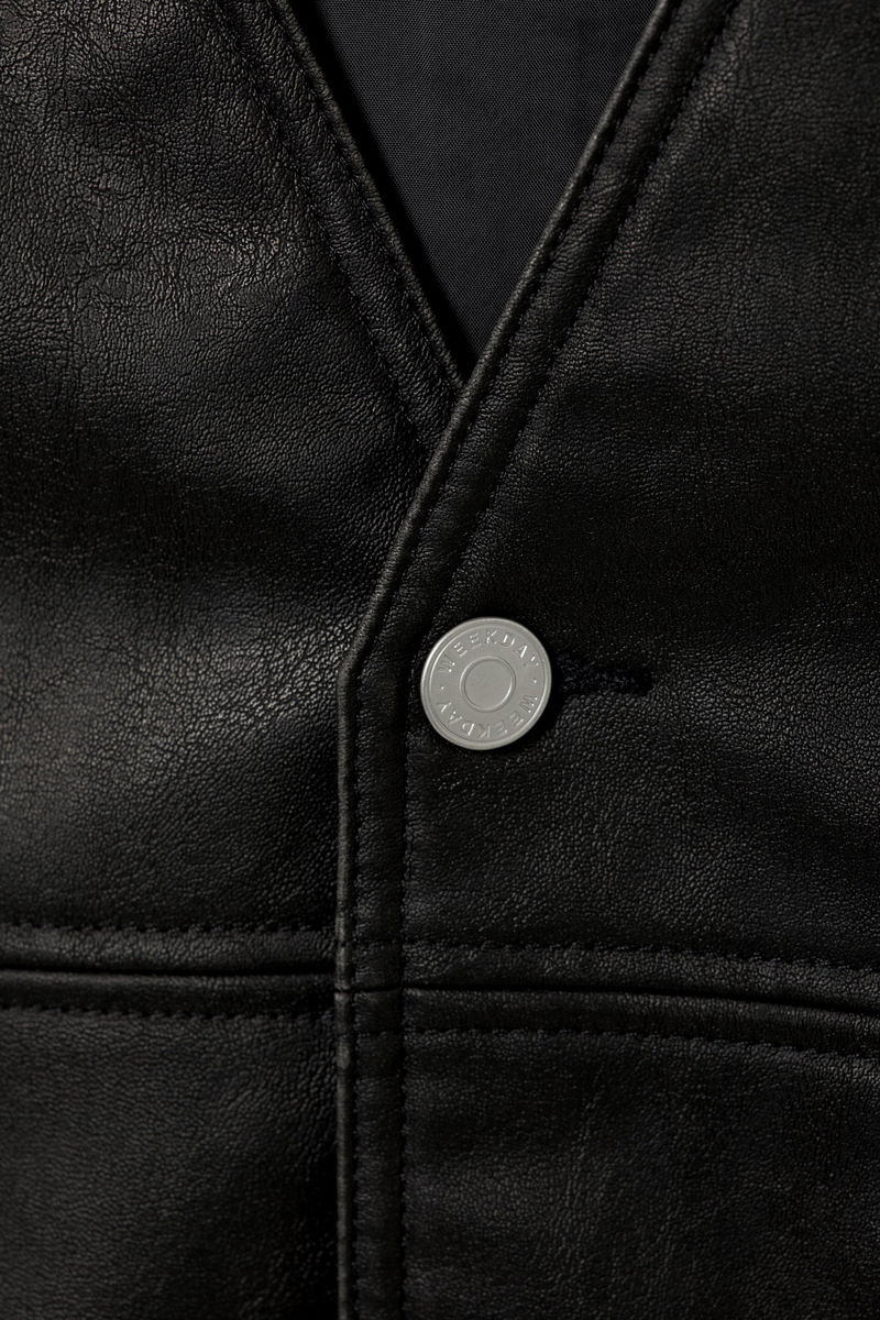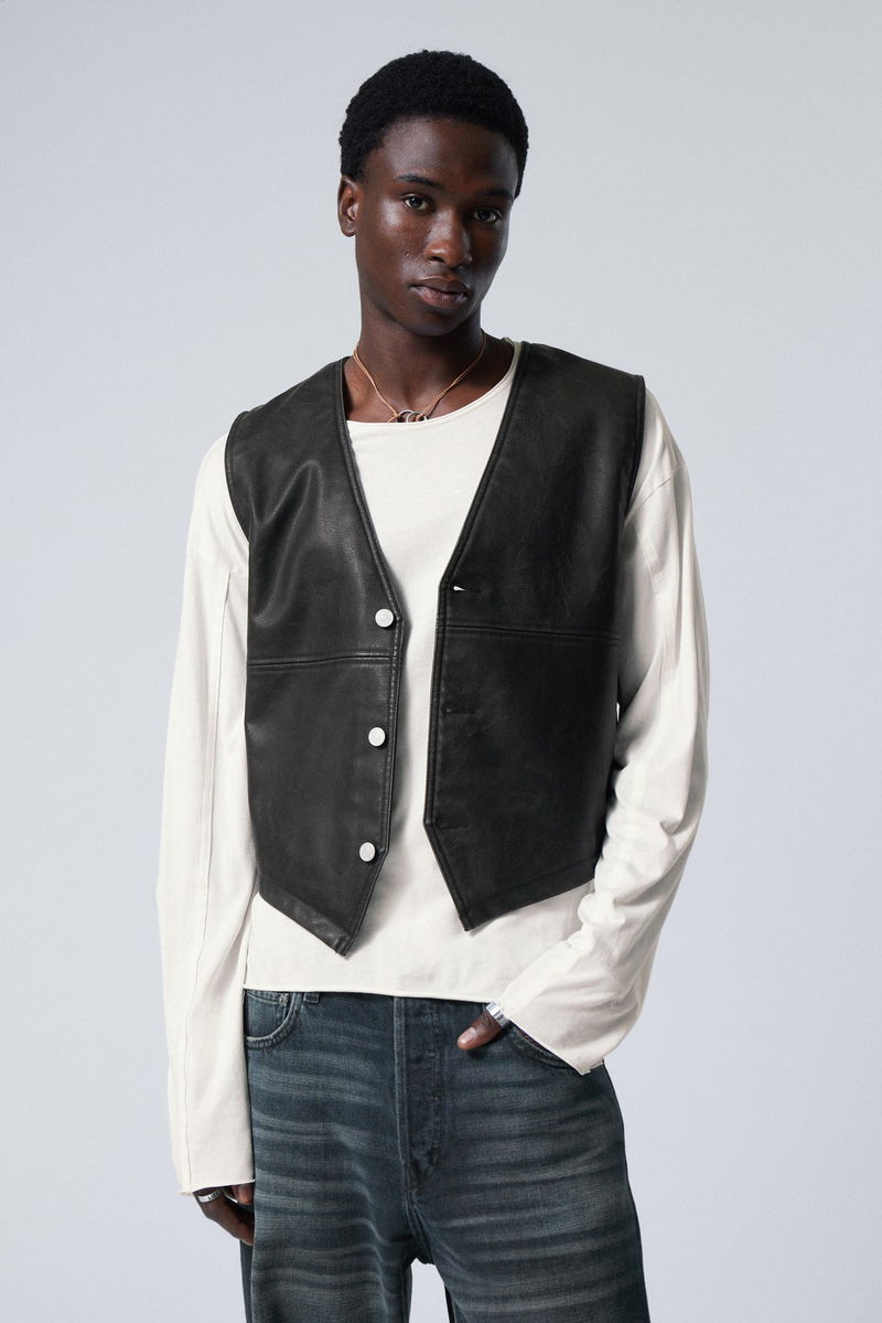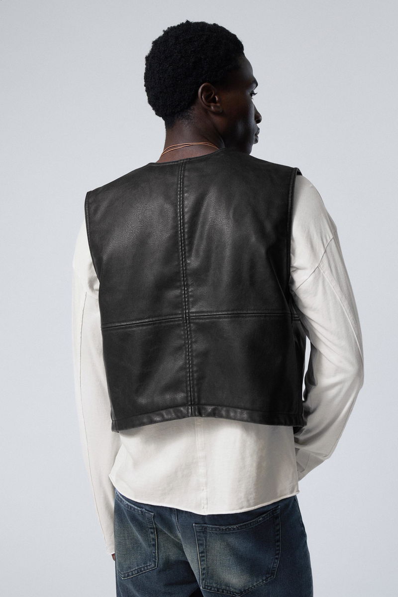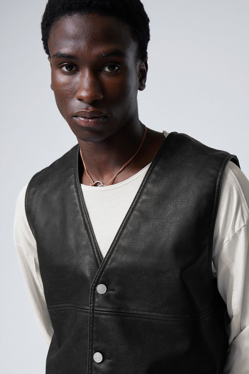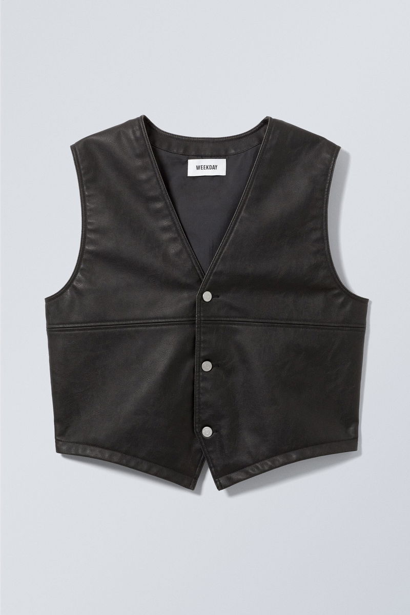 A standout faux leather vest, crafted from water-based polyurethane and recycled polyester, and lined with silky recycled polyester taffeta.