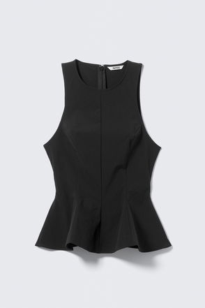 A stand-out fitted drape top made from a lightweight recycled nylon fabric. This go-to top has a boatneck with a twisted shoulder detail, one adjustable shoulder strap, an asymmetric open back, and darts at the bust.