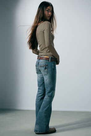 A pair of low rise jeans with a slim fit, flared leg and long length.