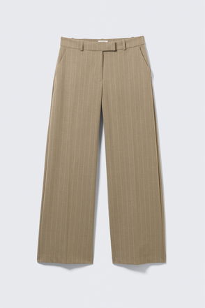 A pair of straight leg tailored trousers made from a quality recycled polyester and ecovero viscose blend twill with a touch of elastane for extra flexibility. They have pressed creases in front and back, a discreet hook bar and buttoned closure, two side slit and two back welt pockets.