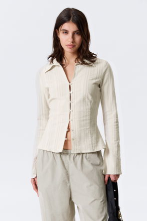 The Franca Blouse is a short and boxy blouse with a subtle print for a dreamy style. It has a notched collar, elbow-length raglan sleeves, a straight hemline at the front and a round hemline at the back. - The model is 178 cm tall and wears size small, that measures 115 cm in chest circumference, 52 cm in length and 73 cm in sleeve length.