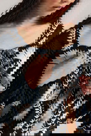 It features hook-and-eye closures at the front and subtly flared cuffs with cascading ruffle trims.