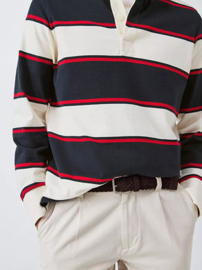 A slightly oversized classic rugby shirt made from 100% organic cotton. It is two-tone and has three front buttons and a pointed collar.