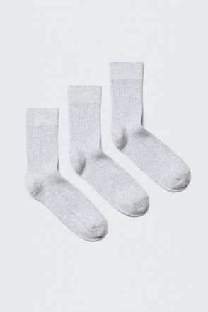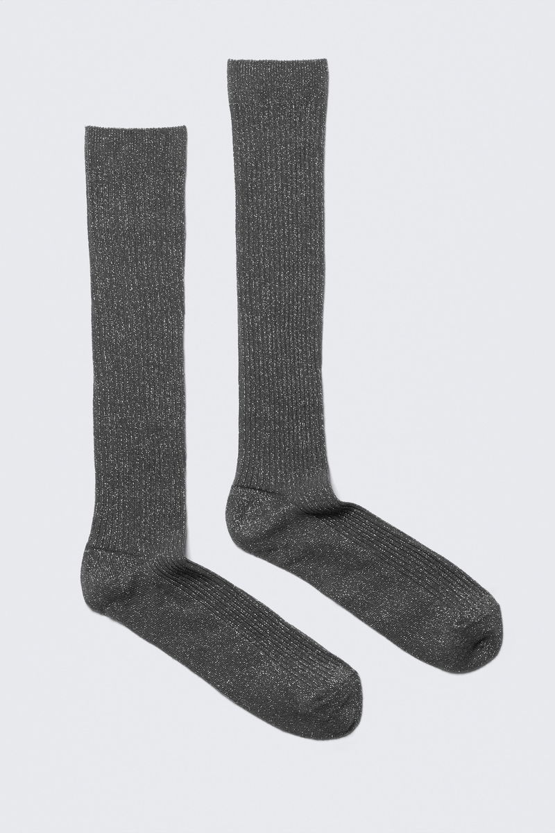 A pair of mid-high socks with a subtle sheen, crafted from a thin, sheer glitter knit. They feature a rib structure with a 30 cm shaft height, designed with a plain knit structure for a lightweight feel and comfortable fit.