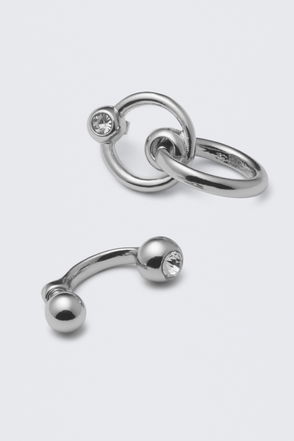 A pair of half-hoop earrings crafted from recycled zinc and recycled brass. They feature a ball-pin closure and are adorned with a diamond-shaped metal stone.
