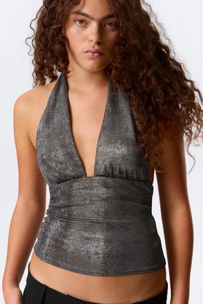 The top features a scoop neck, a halterneck tie with a closed back and short sleeves.