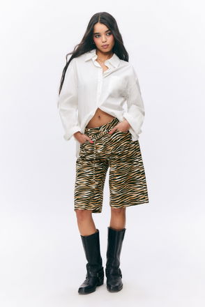 The Hazel Shorts are a pair of summery shorts with wide legs, a dropped crotch and a high waist with an elasticated waistband. With a knot detail at the front. Made from organic cotton blend with a crinkled structure.