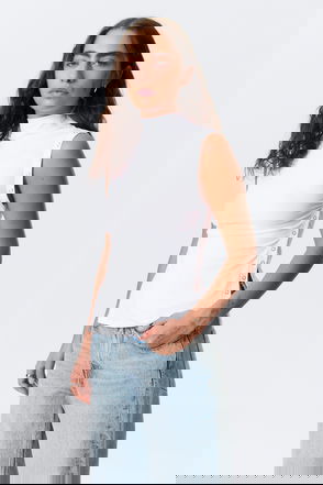 A sleeveless crop top that falls just above the waist made from a soft and stretchy jersey. This layer has a crewneck, raglan armholes, a racer back, fabric binding around the armholes and neckline.