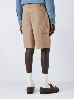 A pair of baggy carpenter shorts made from a sturdy organic cotton twill. They have a low rise, side slit pockets, back patch pockets and a side tool pocket on the left leg.