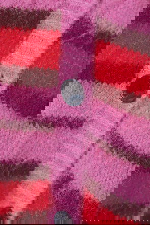 A slightly cropped hairy knitted cardigan sweater made from a soft blend of recycled polyester and recycled cotton yarn. This cozy ribbed sweater has a double-layer turtleneck collar, a single-breasted front button closure, and self-finished edges.