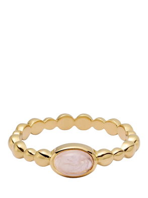 A minimal ring with a graphic flower on top made from a shiny metal.