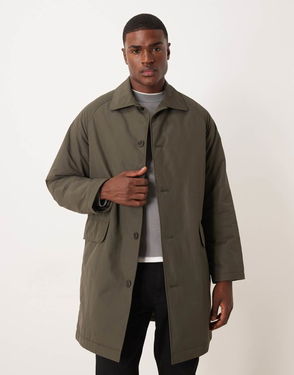An oversized double breasted coat made from a felted recycled polyester and recycled wool blend twill. It has wide lapels, raglan sleeves, side pockets, buttoned cuffs, and a back slit.