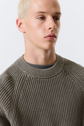 The Jim Utility Sweater makes a subtle reference to military style, with its enhanced shoulders and inside-out seams. In organic cotton blend with a plain knit structure.