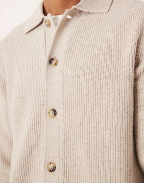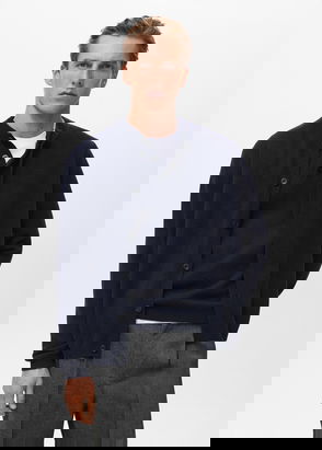 A go-to regular-fit rib-knitted cardigan made from a soft cotton yarn. This layering piece has a deep V-neck with four front buttons, dropped shoulders, a single-layered felt pocket, and ribbed edges.