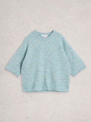 A knitted sweater with a soft hairy texture, made from a fluffy cotton blend. It has a round neck and ribbed edges.