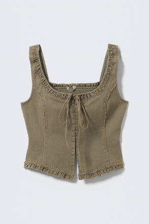 The Kelsie Top is a light, knitted singlet with a stretchy quality and a subtly ribbed structure. With a round, jewel neckline.