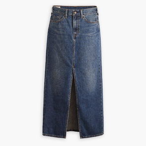A knee-length denim skirt made from an organic cotton rigid denim enhanced with recycled cotton. This style has a classic 5-pocket look and a straight hemline.