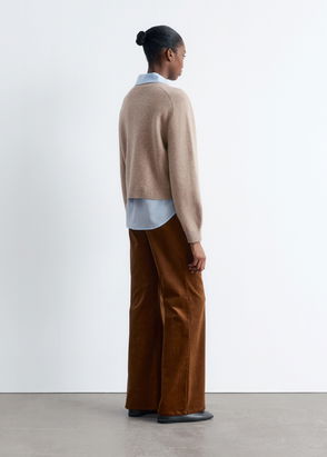 A knitted cotton sweater featuring a V-neckline, front patch-print, and ribbed edges.
