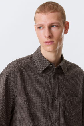 A light knitted short-sleeved shirt with a loose fit. Crafted from soft cotton, it features a pointed collar, a button-up front, and a single chest pocket for a clean, minimal look.